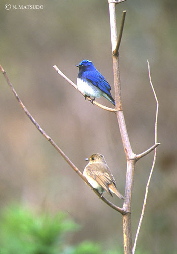 オオルリのオスとメスが上下に並んでいる面白い写真です.