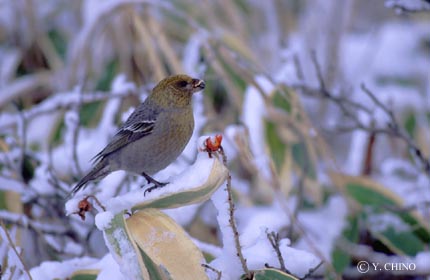 まず、黄色いのでマシコの仲間の雌であることはすぐに分かりますね。