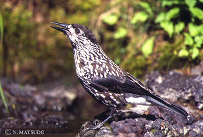●ホシガラス (Nucifraga caryocatactes) 亜高山にいる小型のカラスですが、 大きさは34cmなのでキジバトと同じくらいです。 全身に白い点があり一発で暗記できるでしょう。 関東では富士山の5合目に行けば見られます。 (CHINO)
