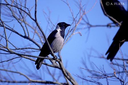 ●カケス (Garrulus glandarius) カラスの仲間のトップバッターはカケスです。 私の世代ですと、おしゃべりカケスのサミーとして記憶に残っていますが、 家の近所(埼玉)では見られなかったのでぜんぜん身近な鳥ではありませんでした。 バードウォッチングをするようになり、「ジャ〜〜」という大きな声を 覚えますと、冬場や渡りの時期など大きな森のある公園などで見つけられます。 先日昭和記念公園(東京都)でも何羽かいました。 カラス科なのに水色の羽がきれいです。 警戒心が強いので写真に撮るのは結構難しいです。 (CHINO)