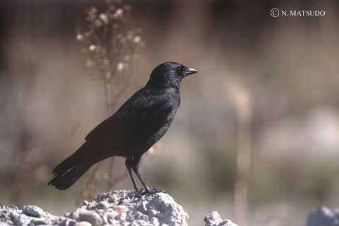 ●コクマルガラス (Corvus dauuricus) 全身まっくろのカラスタイプの中では最小で、 ホシガラスよりも一回り小さいです。 中国〜モンゴル〜ロシアにかけてのアジアで繁殖し、 冬は一部が日本の九州地方にやってきます。 普通はミヤマガラスの群れの中に混ざっていますので、 ミヤマガラスの群れを探すところから始めましょう。 (CHINO)
