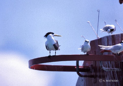 右側にとまっているのはエリグロアジサシ(30cm)で大きさの違いが良く分かる。
