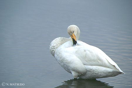 普通に見られるのがこちら。 基亜種のコハクチョウCygnus columbianus jankowskyiで、 くちばしの先が黒く、基部が半分くらい黄色くなっています。(CHINO) | |