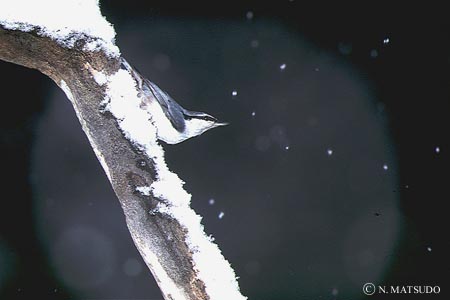 こんな向きでとまっていても、 ちらつく雪を楽しむ余裕があるなんて・・・!! さすが、ゴジュウカラ。(SIMIZU) 【撮影者】 N.MATSUDO 【データ】 1997年1月 北海道弟子屈町 Canon EOS-1N EF5.6/400L