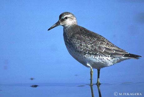 夏羽は茶色で目立ちますが、冬羽はのっぺりと灰色で特徴のないシギです。(FUKAGAWA)