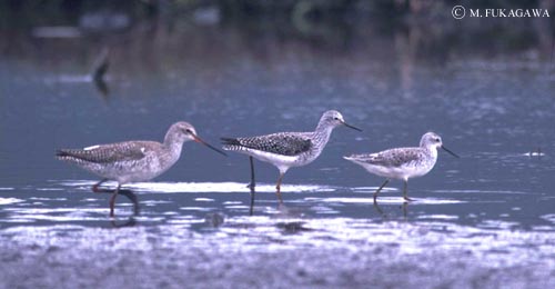 写真は左から、ツルシギ、コキアシシギ、コアオアシシギ。