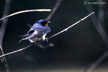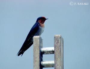●ツバメ (Hirundo rustica) ツバメの仲間では最もポピュラーな種類。 遠目には黒い背中と白い腹、赤い喉のパターンに見えるが、 近くで見るとブルーに光る黒であることが分かる。 人家に巣を作るのは、安全なことと、餌になる虫が多いことから。 人の住まない家には巣を作らないという話もある。(CHINO)