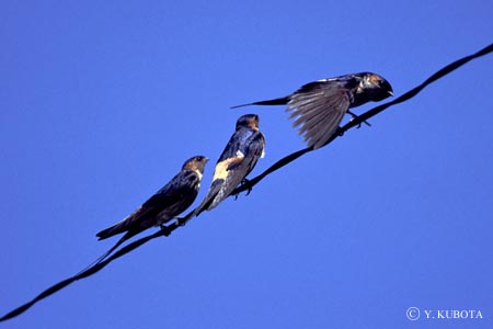 ●コシアカツバメ (Hirundo daurica) 名前の通り腰がオレンジ色っぽく目立つので識別しやすい。 ツバメよりも一回り大きく、かっこいいツバメである。 毎年同じところで繁殖するので、その情報が入手できれば簡単に見る事が出来るが、 大体それは民家なので双眼鏡を持ってうろうろするのがはばかれるのは避けようが無い。 (CHINO)