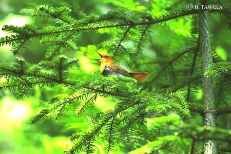 これが経験というものなのだろうか. この鳥は,亜高山の比較的標高の高い針葉樹や広葉樹の境界の森に夏鳥としてやってきます. 色は白いお腹にオレンジの背中というパターンですが, オスの方がオレンジが濃く,胸の白い部分の上端が黒くなっているのでオスメスが良く分かります. (CHINO) | ||||