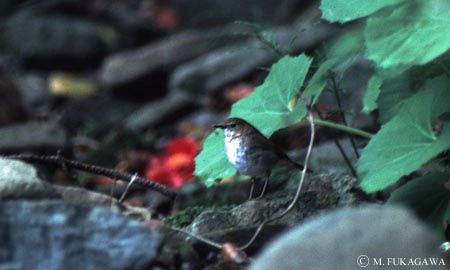| 小型ツグミ類の中では最も見るのが難しい鳥ではないでしょうか? 彼も,渡り途中の個体から声は聞けるのですが藪の中から出てきません. ベージュの背中,白いお腹に薄くうろこ模様があります. (CHINO) | ||||||||
