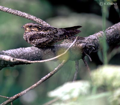| 夏鳥として山地などにやってくるが見るのは難しいかも? というのも夜行性で,昼間はごらんの通り木になりすましている. 以前,富士山の5合目の奥庭に泊まった時は, 夜に飛びながら鳴いている声を聞いた事があったが, 夜なので探しても見付からなかった. 気の利いたドラマでは夜の効果音にヨタカの声 (キョキョキョキョ・・・・・というおもちゃの機関銃のような声) が使われたりするが,夏鳥なので季節に注意してみよう. (CHINO) |